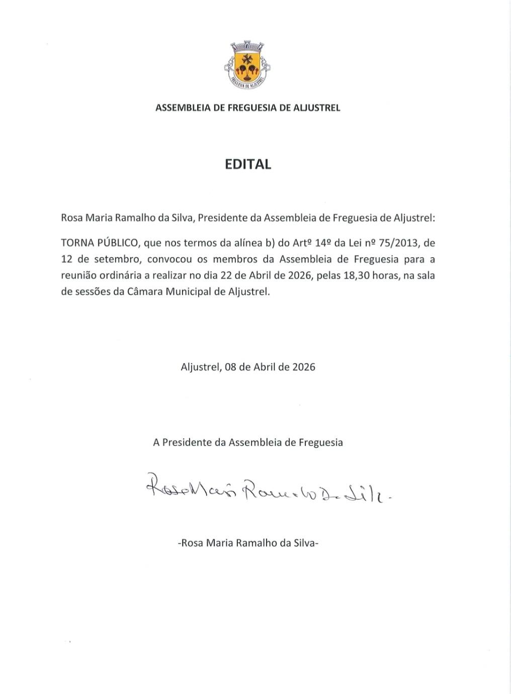 Nos termos da alínea b) do Artº 14º da Lei 75/2013, de 12 de Setembro, informamos que foi marcada a Sessão Ordinária da Assembleia de Freguesia de Aljustrel a realizar no dia 22 de Abril de 2026, pelas 18.30 horas, na Sala se Sessões da Câmara Municipal de Aljustrel.