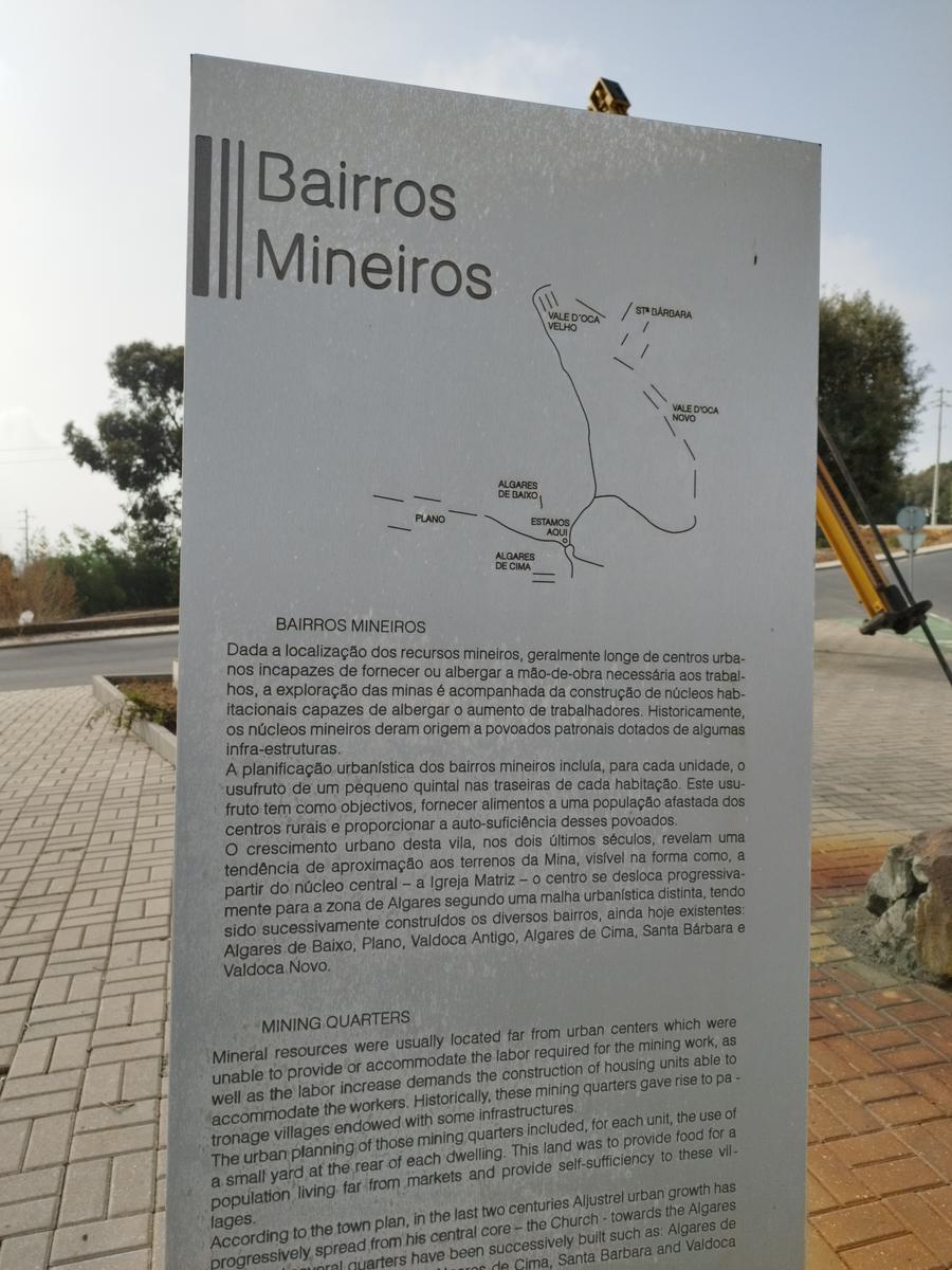 Ao entrar no bairro mineiro de Vale d'Oca, tomar de imediato o passadiço de madeira que mostra vários vestígios da exploração mineira, desde os tempos romanos aos finais do século XX. No final do passadiço, passar junto à central de compressores que alimentava de ar todo o conjunto subterrâneo, passar junto a outro malacate e avistar todo o espaço mineiro ancestral, agora recuperado. Voltar para trás por dentro do bairro mineiro, apreciando alguns exemplares, ainda resistentes, da habitação mineira com a casa de banho do outro lado da rua. Entrar no coração do espaço urbano de Aljustrel seguindo pela Rua Vasco da Gama, Rua 31 de Janeiro, Rua Latino Coelho, Rua José Francisco Silva Álvaro, Rua Cândido dos Reis, Praça 13 de Janeiro, passar por debaixo do arco e seguir pela Rua Dr. Manuel Joaquim Brando.