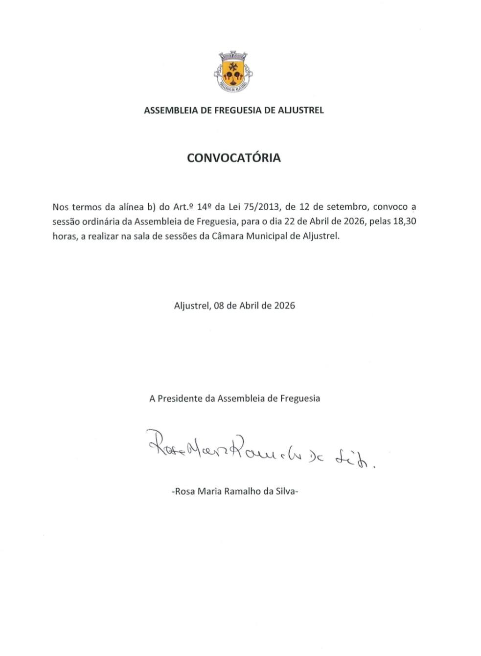 Nos termos da alínea b) do Artº 14º da Lei 75/2013, de 12 de Setembro, informamos que foi marcada a Sessão Ordinária da Assembleia de Freguesia de Aljustrel a realizar no dia 22 de Abril de 2026, pelas 18.30 horas, na Sala se Sessões da Câmara Municipal de Aljustrel.